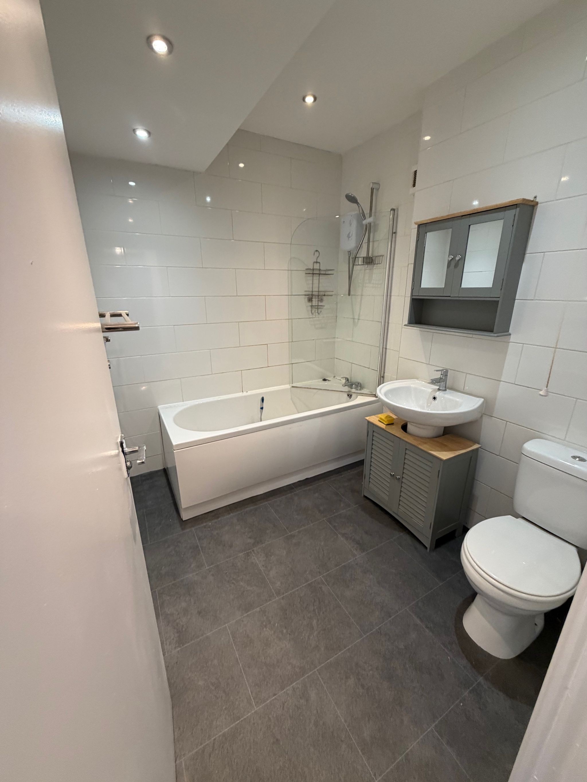 Modern Bathroom with white Suite with over bath shower & glass shower screen; chrome fittings & white wall tiles. Sunken spotlights to the
