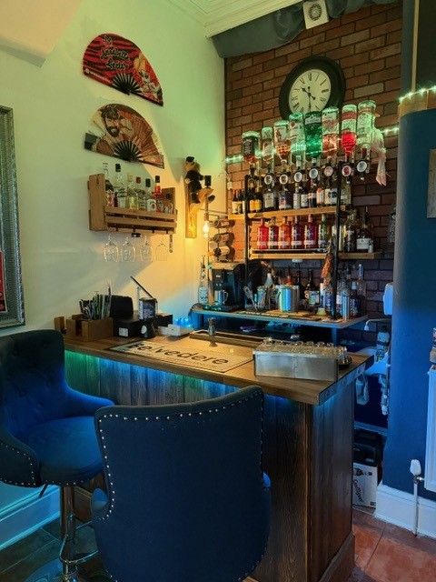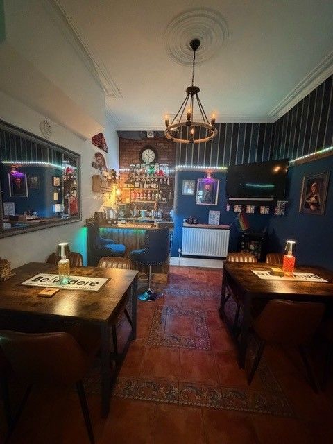 Fabulous Open Plan Bar / Lounge with fitted wooden bar, comfortable seating, chandeliers and ceramic tiled flooring.