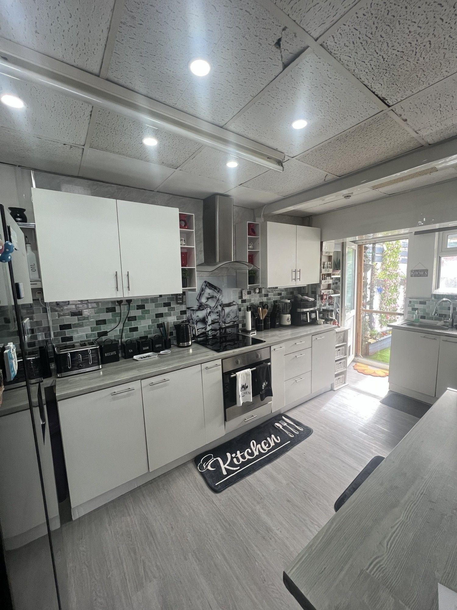 Open Plan Fitted Kitchen with breakfast bar and lounge.